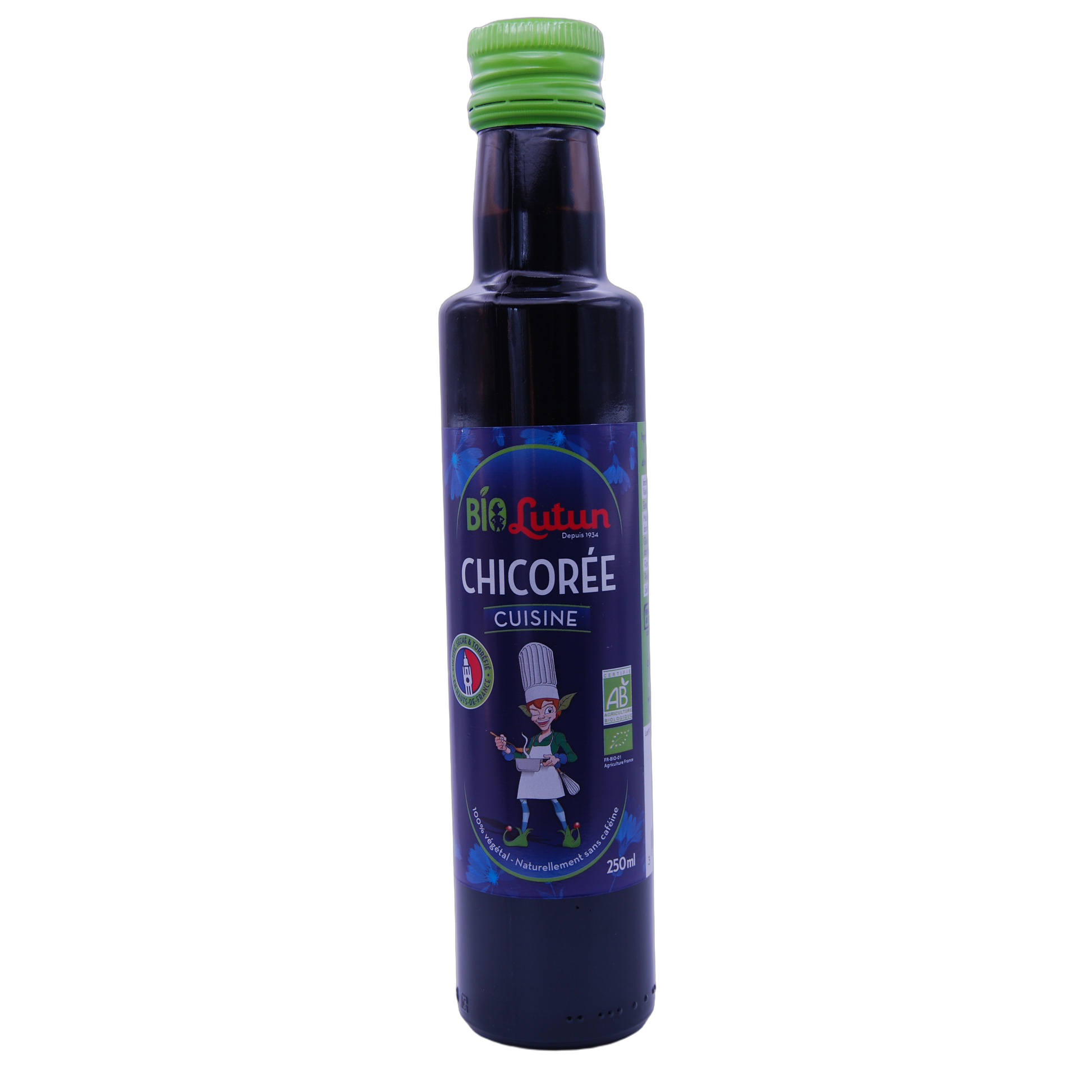 Les racines de chicorée Bio de cet extrait de chicorée liquide sont produites et séchées près de Valenciennes. Elles ont été ensuite lentement torréfiées et mis en bouteille à Oye-Plage par Chicorée Lutun qui travaille la chicorée depuis 1934.